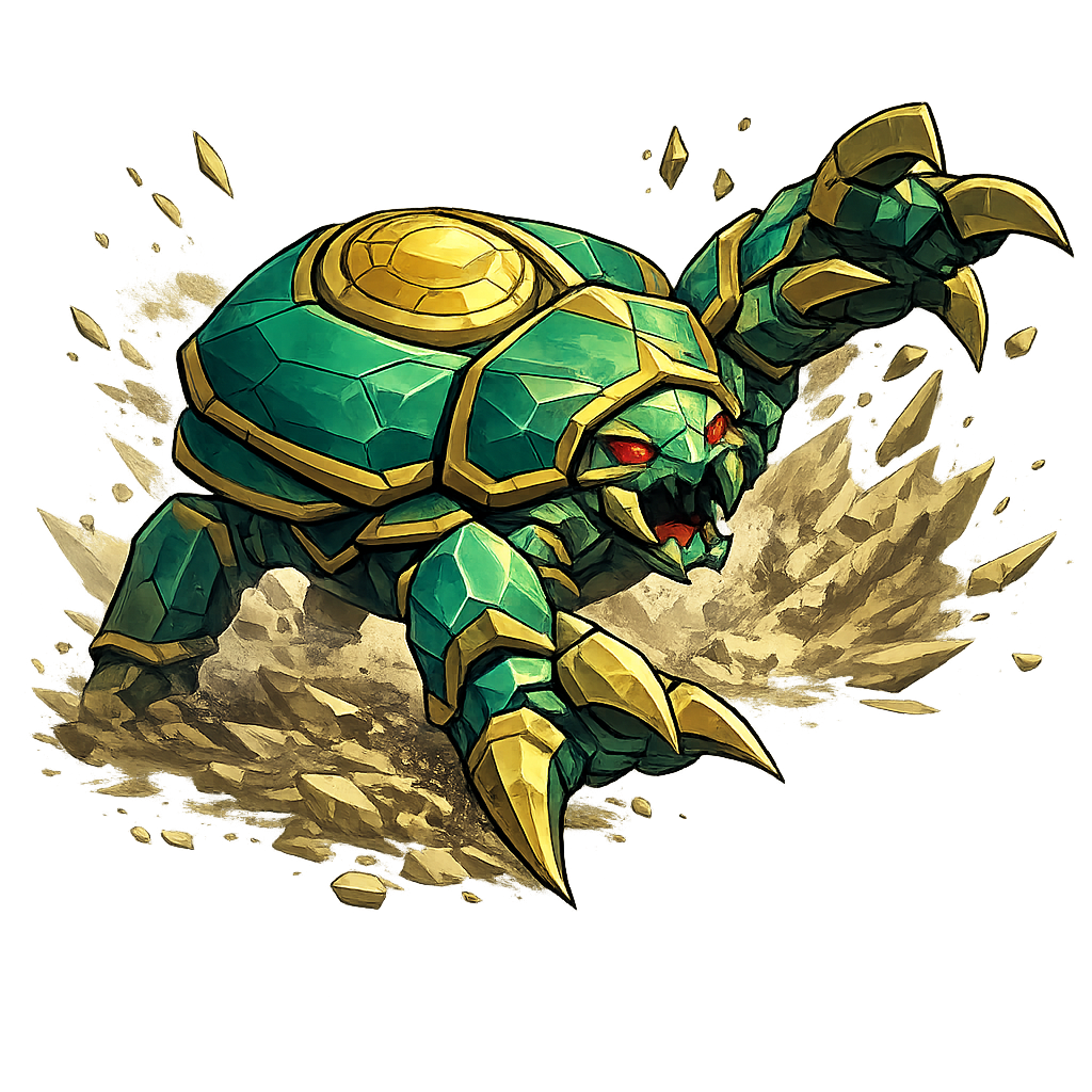 Khepri drives forward with the force of stone — a weighty strike that scales with his own defensive mass. Slow to stop. Painful to absorb.